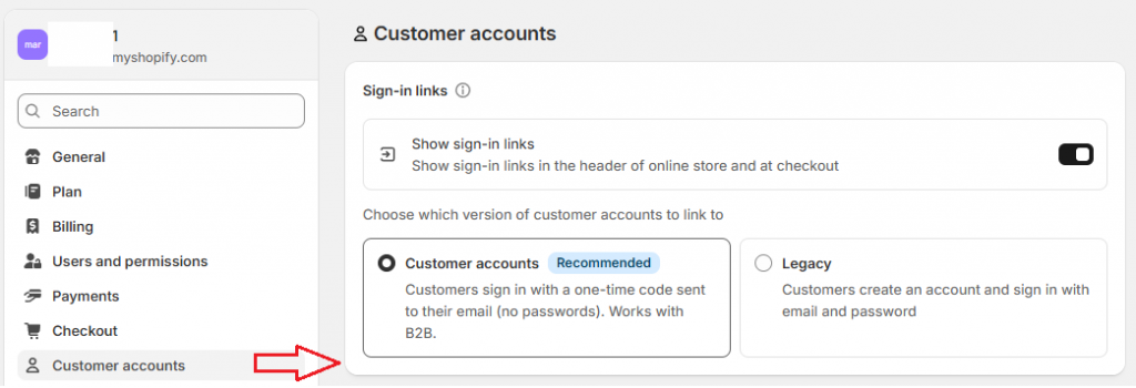 To help your customers access their accounts again, you can manage this in Settings → Customer accounts in your Shopify admin. Shopify currently offers two account options (see image below), and the reactivation process depends on which one you choose: