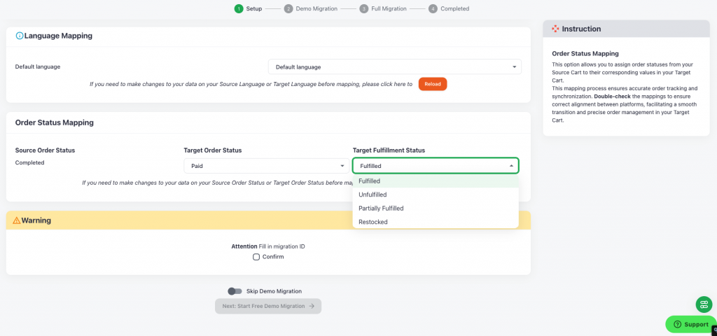 - When you’re at the step of configuring migration, you’ll be able to see Language, Order Status, and Customer Group Mapping below Additional Options.