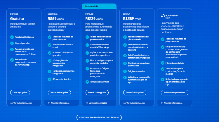 | Impulso | R$139 | Lojas em crescimento com mais ferramentas |